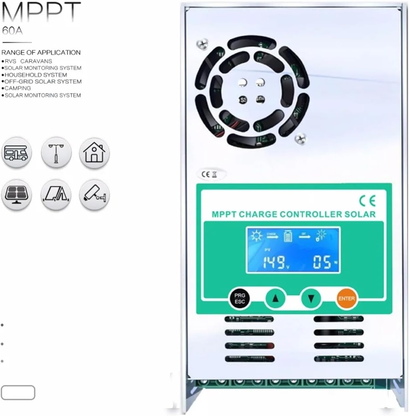 MPPT Solar Charge Controller 60A Battery Charger 12V 24V 36V 48V Auto Max PV 190VDC For Lead Acid Lithium BatteryFeature:100% MPPT controller!Intelligent Maximum Power Point Tracking technologyBuilt-in DSP controller with high performanceAutomatic battery voltage detection 12V/24V/36V/48VThree-stage charging optimizes battery performanceMulti-function LCD displays, Reverse polarity protection of solar panelOvercharge protection, Can be mounted easilySuitable for battery types of sealed lead acid, vented Gel, and Lithium batteryPackage Including:1PC MPPT Solar Controllers1PC User Manual (English)Notes:The output terminal is for lamp only( 12V system less 60W, 24V/36V/48V system less 100W ),and it will be burnt if connecting to other loads.The output for battery is no polarity reverse protection.you can put two pieces 60A in parallel , So total is MPPT 120A==========Application : Charger Controller,Solar System Controller,Voltage Controller,Lighting ControllerModel Number : MPPT Solar Charge Controller Solar RegulatorMaximum Current : MPPT 60ACharging mode : MPPT Maximum power point tracking automaticallyRated output current : MPPT 60AThe maximum PV input power : 12V system (720W) 24V system (1440W) 36V system (2100W) 48V system (28The maximum PV input voltage (Voc) : DC190VEnclosure : IP21Battery type(default is Sealed) : Vented/ Sealed / Gel / NiCd / Lithium battery(defined voltage for othe