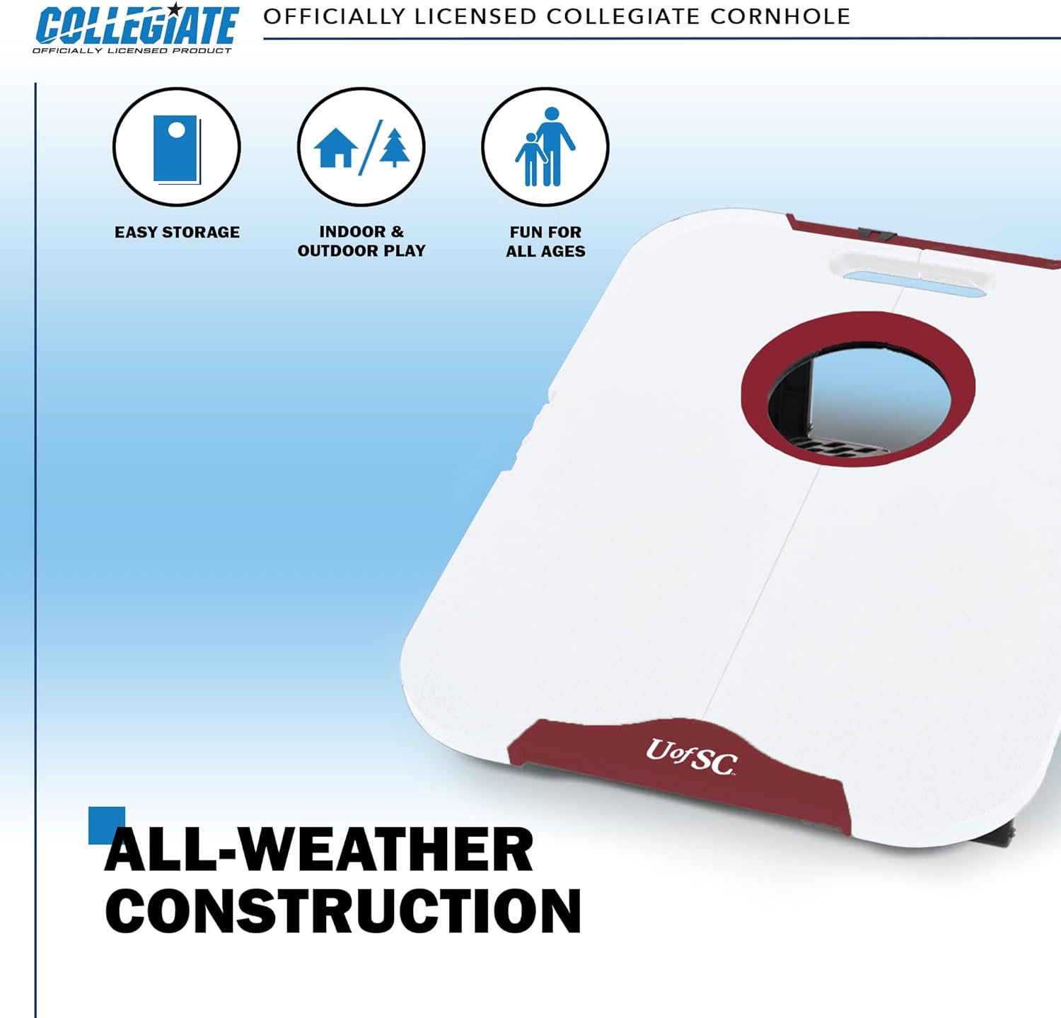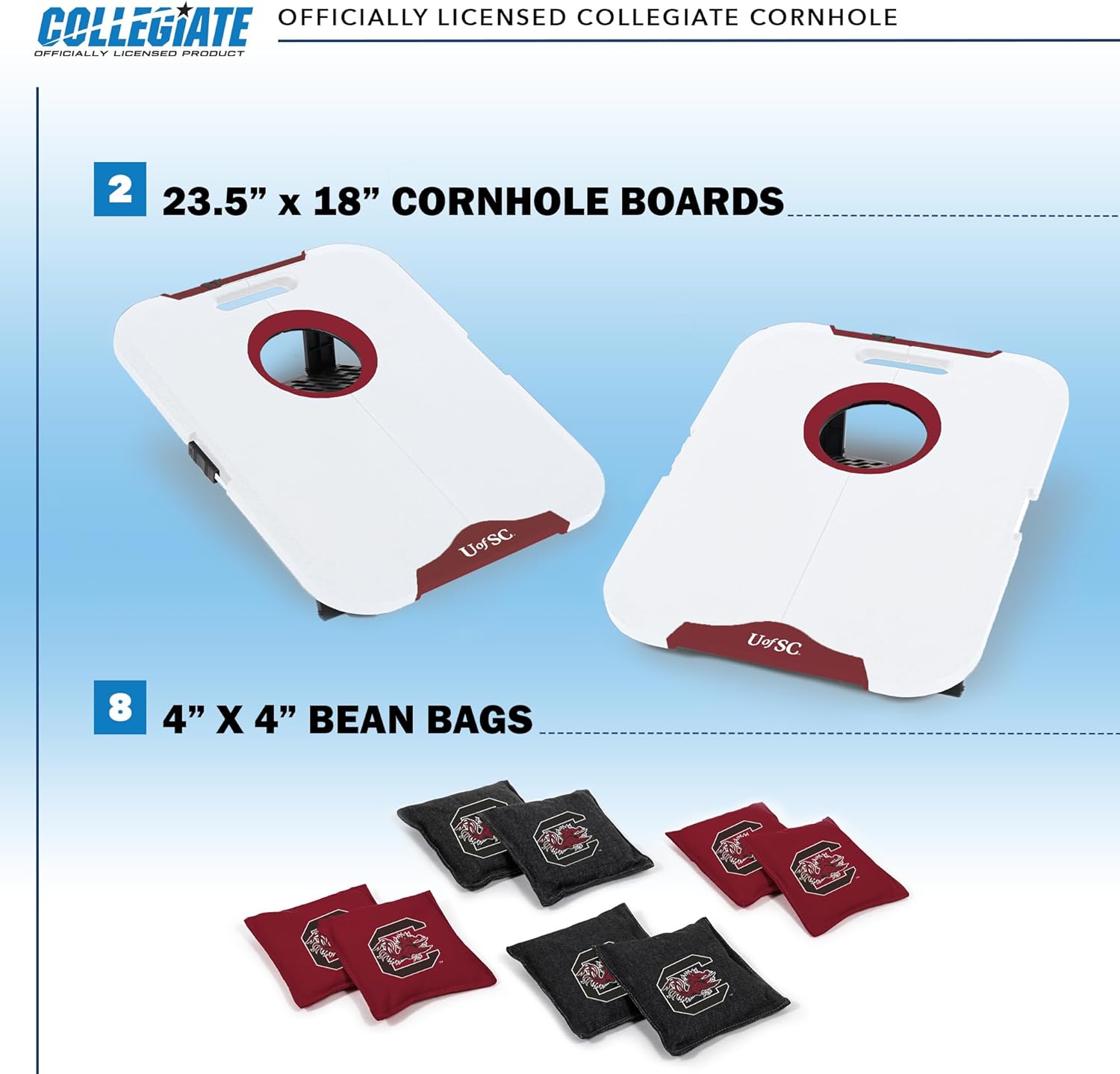 Get in on the cornhole action with the Officially Licensed Collegiate Travel Cornhole Set, the ultimate addition to any NCAA fan's collection. This set includes two All-Weather Cornhole Boards featuring your favorite NCAA school and offers durability and style that hold up in all weather conditions. With the integrated bean bag return system and storage compartments, setup and cleanup are a breeze, ensuring more time for fun. Its portable design, complete with carrying handles and foldable boards, makes transportation effortless, perfect for impromptu games at the park or backyard. So, whether you're hitting a tailgate party or taking the family to the beach, this cornhole set is the ideal set for players of all skill levels and is always ready for action. Get ready to toss, score, and win with the Officially Licensed Collegiate Cornhole Set, a must-have for any NCAA fan’s outdoor adventures.